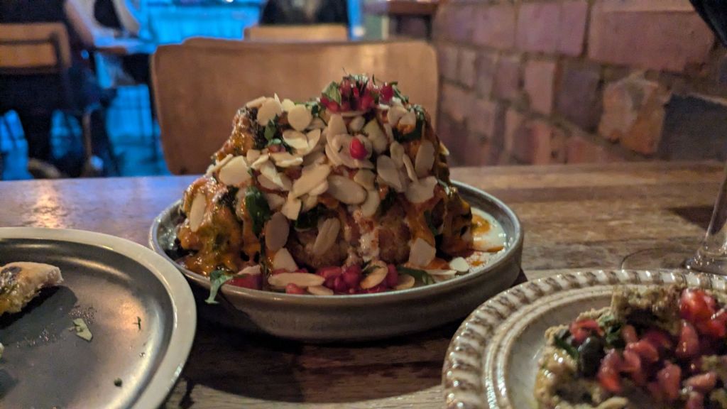 Half a head of cauli was presented to me topped with, and resting on, a series of Middle Eastern treats. If you ever need to make the case for vegetarianism, this could be the dish to do it.